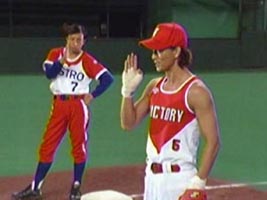 球二は驚異の動体視力を駆使するダイナマイト拳の超前進守備の前に凡退(凄いプレイなのだから、その凄さが分かる演出にして欲しいなぁ。まぁ、原作でも淡泊に処理されたけど)、打席には球三郎が登場。薔薇の花道は思いっきり豪華にやって欲しかったのだが、低予算なのか(?)、かなりショボい代物に…。球三郎の痛打を陣流拳法奥義・波がえしで打ち返す大門がイカす。原作ではバットで防いだボールは後方へ転々としたのだが、どうやらTV版球三郎はバント技術に長けているらしく、きっちり打球を殺して、ホームペース上にきっちり落とす。ならば、キャッチャー・ホープはそのボールをすかさず拾ってタッチすればいいものを何を呆然としていたのか、球三郎がのんびりと一塁へ行くまで何もしなかった模様。ローラーゲームあがりの所為で咄嗟の判断が出来んのかのぅ。