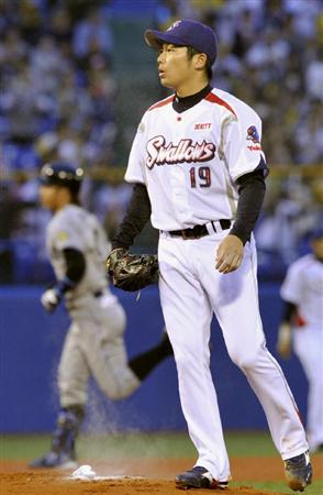 開幕から5度の先発で未だに白星を掴めない石川はこの日も初回から鳥谷の4号2ラン,ブラゼルのタイムリーで早々と3点を先制される苦しい展開。2〜5回まで悉くヒットの走者を出しながら、あと一本を許さない粘り強い投球を見せるなど、6回まで追加点を与えなかったが、味方打線は阪神先発・ソニックの前にゼロ行進を続けるばかりで結局、6回裏に代打を出されて、またもや白星ならず。7回から代わった高木に対し、阪神は一死一、三塁のチャンスを掴むと、不振を極める余り、矢野の起用を望む声が高まる中、真弓監督の寵愛を受けてスタメン起用されているJ.マッケンジーが意地の4号3ラン。8回には連続出場試合記録更新の為に出てきたキュラソ星人が実に12年ぶりの代打ホームランを叩き込むと、9回にはブラゼルが8号2ランと一発攻勢でヤクルトを突き放した。6回二死までパーフェクトピッチングを見せていたソニックは終盤に入って疲れが出たか、7,8,9回と1点ずつ許したものの、完投で3勝目をマークした。